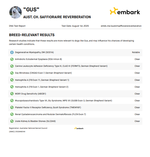 As Gus is linebred on his grandsire Multi. Ch. CIB Echo du Bois des Ternes (Imp FRA) “Echo”, he produces an excellent consistent type when outcrossed to unrelated lines like our own. We are honored to have a piece of renowned Echo in our home and lines.